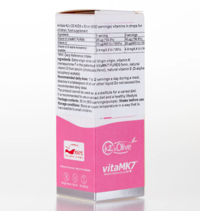 The product contains a dose of vitamins K and D adapted to the needs of children. One drop provides 25 µg of natural vitamin K2 mk7 in a patented form VitaMK7® and 400 IU of vitamin D in the form of natural cholecalciferol derived from lanolin. The vitamins have been dissolved in virgin olive oil, thanks to which they are highly absorbable.